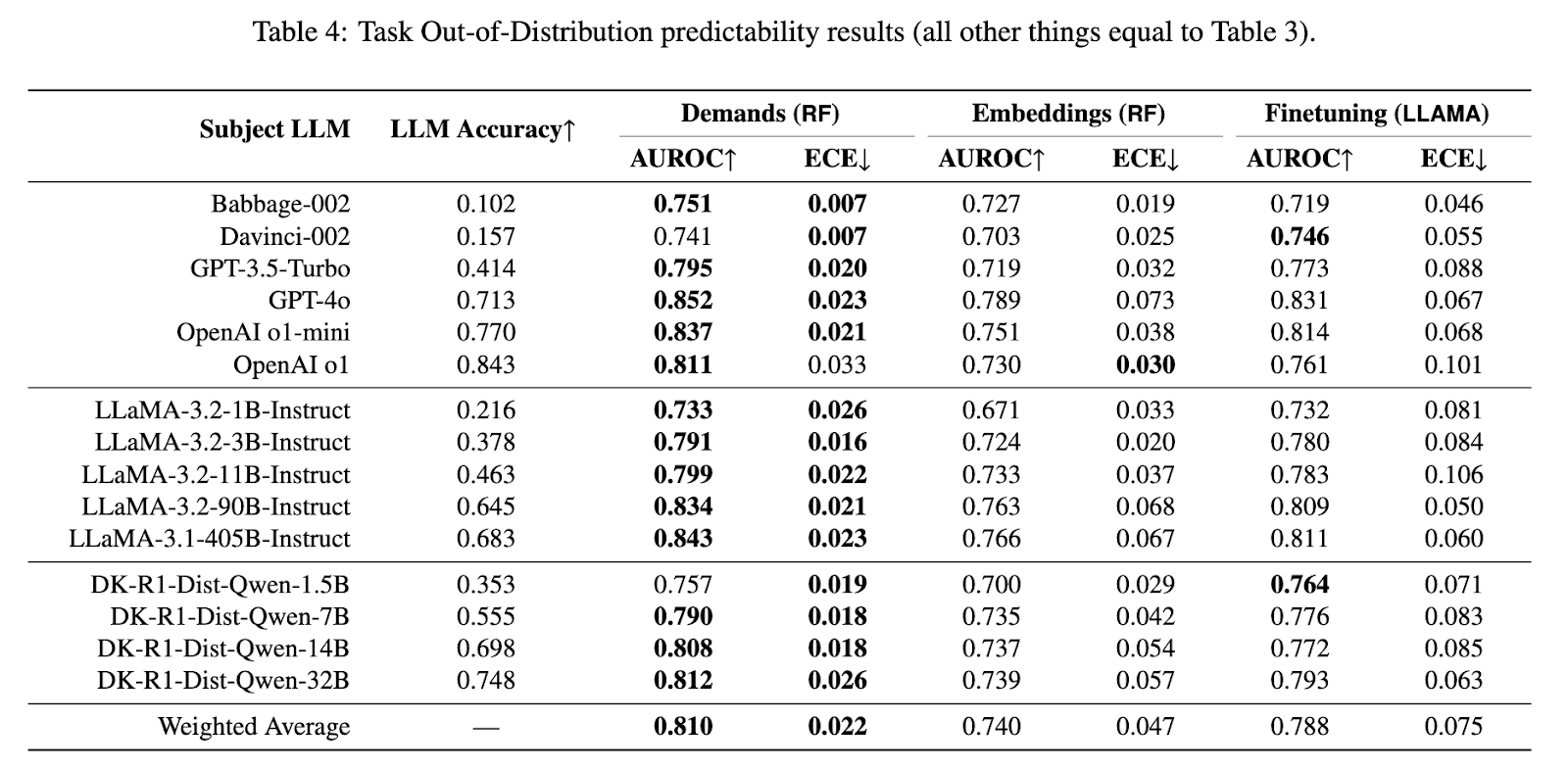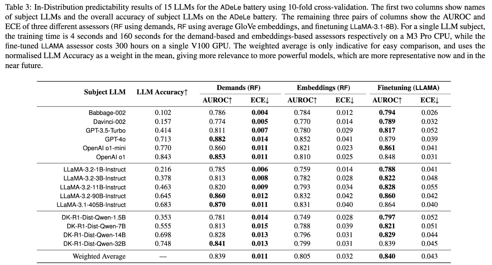The most important advantage is that this methodology simultaneously achieves predictive and explanatory power of AI evaluation at the task instance level. This does not mean to predict the output token-by-token. Instead, it allows predicting success – or other indicators – for a given task instance. The dimensions and scales in this methodology are highly informative. A random forest trained on task demands and instance performance outperforms a finetuned LLaMA-3.1-8B on discrimination (AUROC) out of distribution, and calibration (Expected Calibration Error) in-distribution and out-of-distribution (see tables 3 and 4 below). The difference is particularly salient in the case of calibration and out-of-distribution, where the ECE metric is 0.022 for the demand-based random forest vs 0.075 for a finetuned LLaMA. In contrast, the random forest performs only marginally better than LLaMA on the AUROC metric[3], even when the difference is statistically significant.