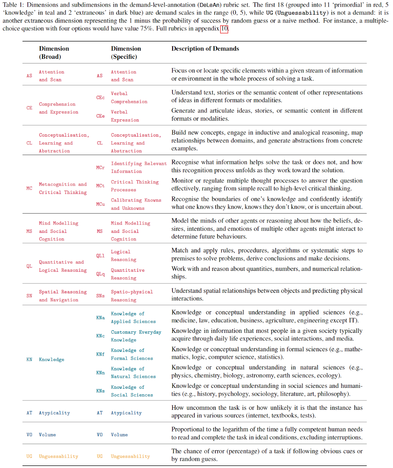 The core methodological innovation is to introduce a small number of (conceptually distinct) dimensions that capture the demands of any task instance (see Table 1 below), and match them with the capabilities of the AI system. These dimensions are based on the literature in AI, psychology and animal cognition; and are organised hierarchically to be a set of general or universal cognitive capabilities. Since these dimensions are defined with rubrics in natural language that are human-interpretable, the success or failure of AI systems (validity) will be explainable. Since these dimensions cover many[1] dimensions of model capabilities, the system's validity shall be highly predictable.