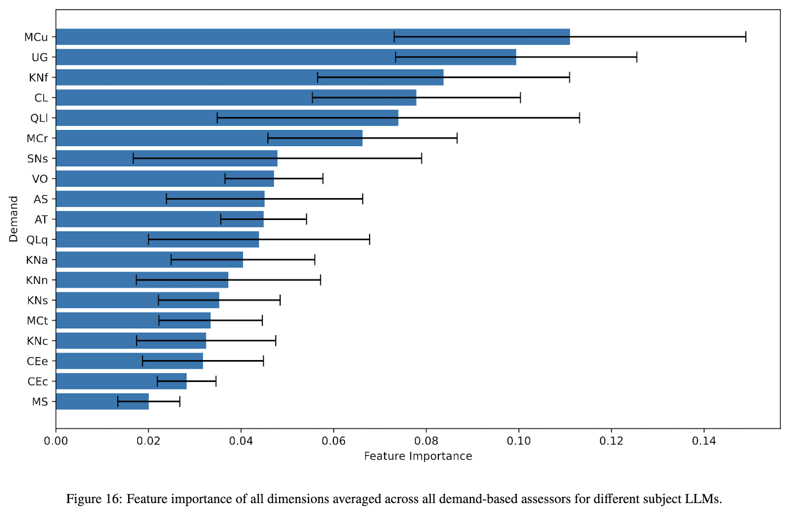 Our approach prioritises both predictive power and human interpretability over uncorrelation. While the 18 dimensions are fairly correlated within the selected individual models, demands may be significantly less correlated across different tasks, which is why having more granular (but interpretable) dimensions can improve predictive accuracy. The paper demonstrates in Appendix 9.5 that 11 broader dimensions achieve comparable predictive power, but we retain the finer subdivisions because they provide more detailed explanations of model behaviour. Since evaluating each dimension is computationally inexpensive, we believe this design choice is justified despite the added conceptual complexity. Further, as can be seen in Figure 16 below, all features retain relative importance in the final predictive power. If all features were fully correlated, one feature would display a feature importance value of 1, and the rest would be 0.