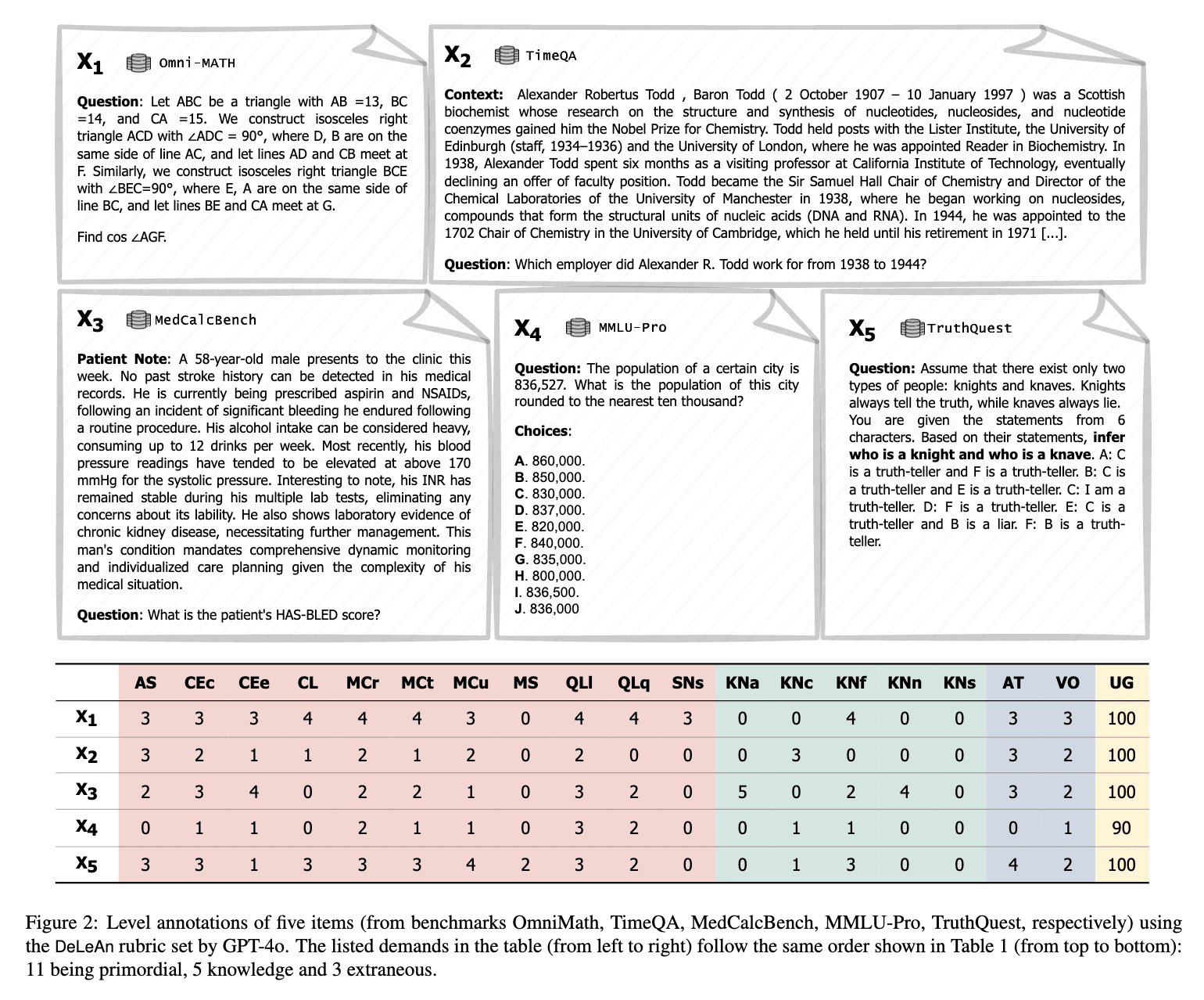 One could potentially substitute ADELE with well-designed benchmarks that capture the dimensions you care about – though achieving external validity could often require an analysis similar to ADELE – or, for a specific domain, the tasks you care about. If so, the results of the benchmarks would become proxies that substitute the demand scales in ADELE. However, this has two conceptual issues: (i) you would have to make sure that you include all the relevant difficulty levels, and (ii) benchmarks measure tasks, not cognitive capabilities, so you would need your distribution of tasks to carefully mirror the tasks you care about in practice. What is worse, while there exist good benchmarks specialised in specific cognitive abilities (e.g. quantitative reasoning and Frontier Math (Glazer et al, 2024)), many benchmarks contain tasks that require a mix of capabilities, which could confound the conclusions (see Figure 2 below).