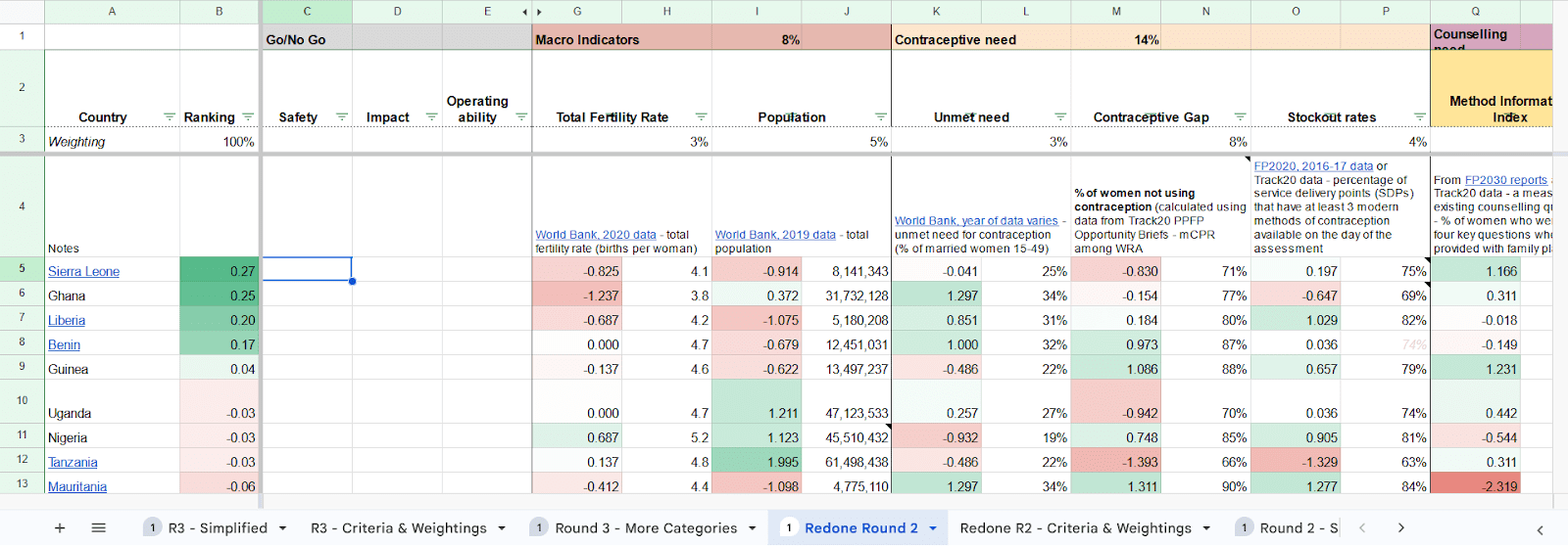 Example Weighted Factor Model for selecting a country in which to launch a pilot from one of our charities