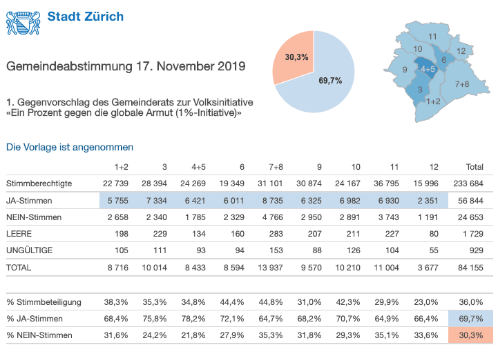 - In November 2019, the counterproposal passed with a 70% majority. Zurich’s development cooperation budget will thus increase from around $3 million to around $8 million per year. The city will aim to allocate it “based on the available scientific research on effectiveness and cost-effectiveness.” This seems to be the first time that Swiss legislation on development cooperation mentions effectiveness requirements.