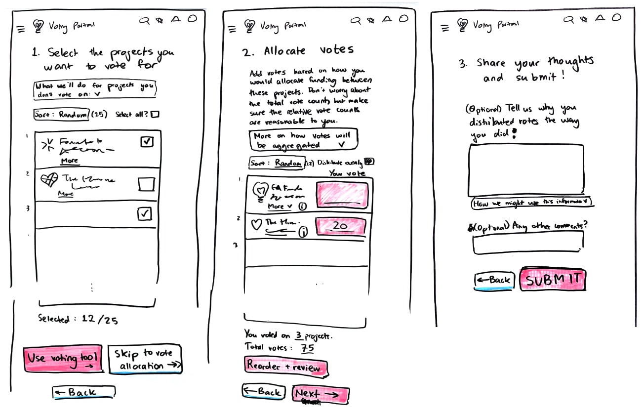 We wanted to prompt people to deliberately select projects to vote on to avoid encouraging people to semi-randomly assign small votes on projects they hadn’t thought much about (which might then get counted a lot if the major projects they’d thought about would get eliminated), and to make the point allocation step simpler for someone who just wants to distribute funding to their top 3 charities or the like.