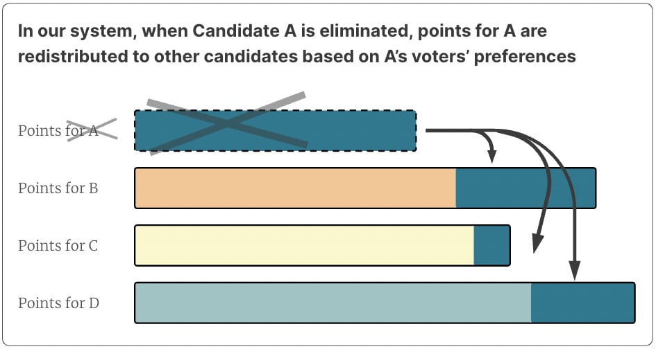 In classical ranked-choice voting, voters submit a ranking of candidates. When votes are in, the least popular candidate is eliminated in rounds until a winner is declared. After each elimination, voters’ rankings are updated with the eliminated candidate removed (meaning if they ranked the candidate first, their ranking moves up), so votes for that candidate are not wasted.[4]