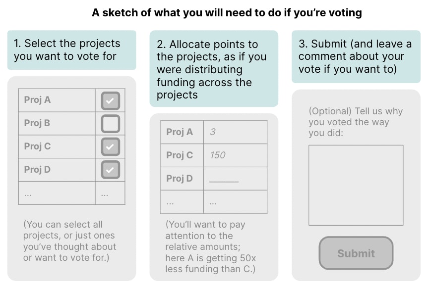 - Assign points to the candidates you’ve selected, based on how you personally would allocate funding across these different projects (paying attention to the relative point ratios)[2]