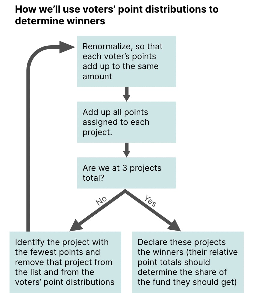 In brief: we’ll use a weighted version of ranked-choice voting to determine the winners in the Donation Election. Every voter will distribute points across candidates. We’ll add up the points for all the candidates, and then eliminate the lowest-ranking candidate and redistribute points from voters who had given points to the now-eliminated candidate. We’ll repeat that until we have 3 winning candidates; the funding should be allocated in proportion to those candidates’ point totals.
