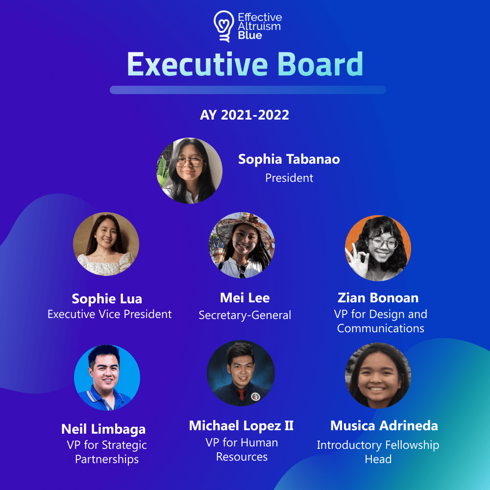 Hey everyone, I’m Kirsten Angeles, former president of EA Blue, a student group in the Ateneo de Manila University in the Philippines (our chapter is called EA Blue because we are an unaccredited organization in our university, so we can’t use our school’s name but can use our school’s color; hence EA Blue instead of EA ADMU). I’m writing this post to share what happened over EA Blue the last year from June 2020 to July 2021 to those not very familiar with us yet. We hope this can help other group organizers and EAs to learn a little more about us, and perhaps get some insights from our experiences this year that might be helpful to their groups in the future. We’re particularly hoping that group organizers who are still starting off would be able to find this helpful. This post is approximately a ~20-minute read, and we’ve also provided a ~1-minute summary. We hope you find this helpful!