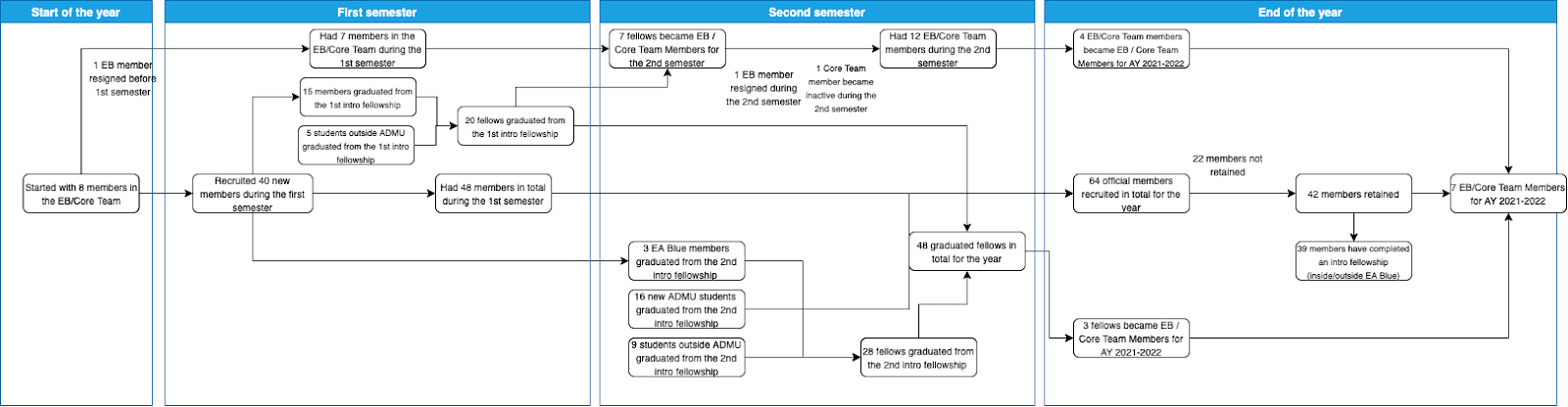 - We’ve just completed a successful second year as a university group in the Philippines, and now have more engaged members and a great core team - EA Blue started off last 2019 with few core team members and few active members in the organization. We started this year with 7 members in the executive board (EB) and core team and recruited 7 more members into our EB/Core Team for the Academic Year (AY) 2020-2021. We had a total of 48 fellows graduate from our introductory fellowships and ended the year with a total of 42 members in the organization.