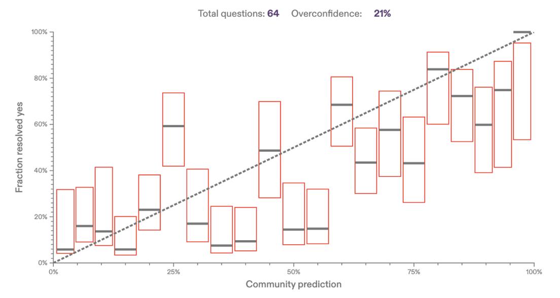 Metaculus makes no claim that the Community Prediction is perfectly calibrated, but neither do we have enough information to claim that it is not well-calibrated. Using 50% confidence intervals for the Community Prediction’s “true probability” (given the fraction of questions resolving positively), we find that about half of them intersect the y=x line, which indicates perfect calibration: