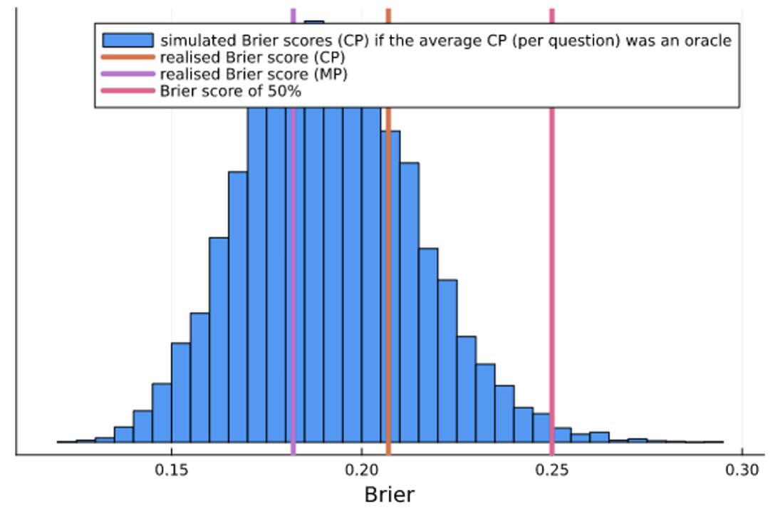 An average Brier score higher than 0.25 means that we’re better off just predicting 50% on every question.