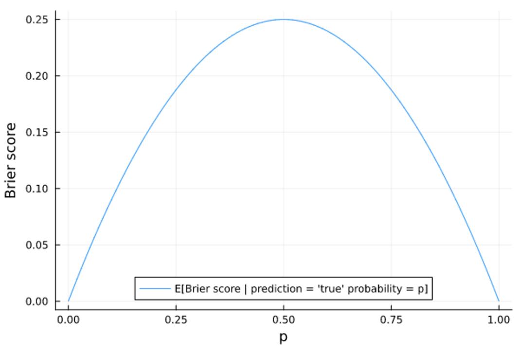 No. Here’s why. Let’s assume for a moment that your forecasts are perfectly calibrated. In other words, if you say something happens with probability p, it actually happens with probability p. We can map the relationship between any question whose “true probability” is p and the Brier score you would receive for forecasting that the probability is p, giving us a graph like this: