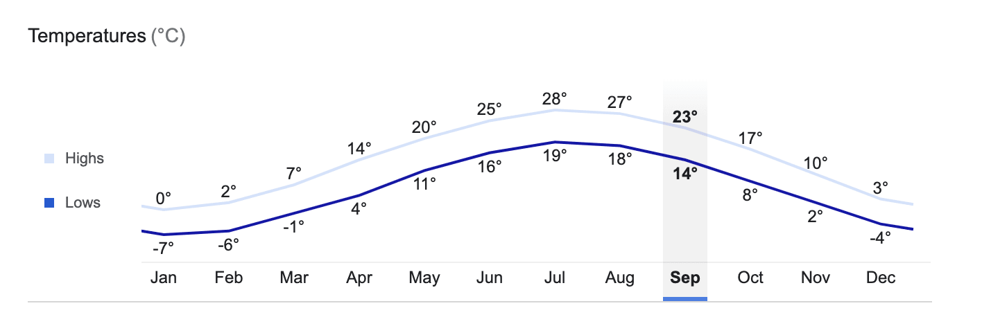 The average temperatures look pretty similar to Boston, meaning it gets pretty cold in winter and warm in summer. However, the lake brings a pleasant summer breeze into the city, helping to fight higher summer temperatures.