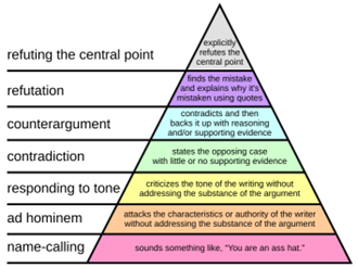 Graham’s Hierarchy of Disagreement values quotation and logic, but it ignores that refuting testimony may be impossible in short time-frames, that identifying common ethical values do depend on one’s character, and it ignores the importance of communication such as checking for comprehension.
