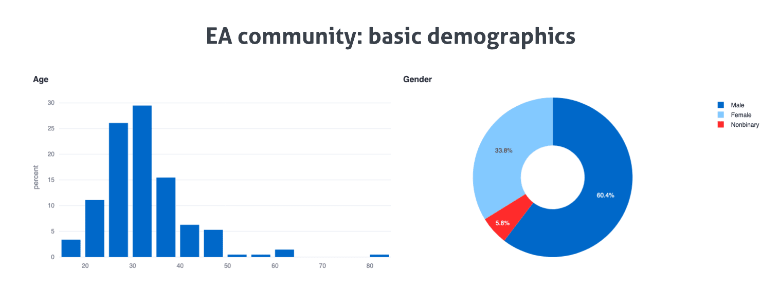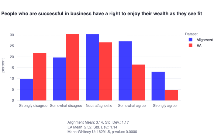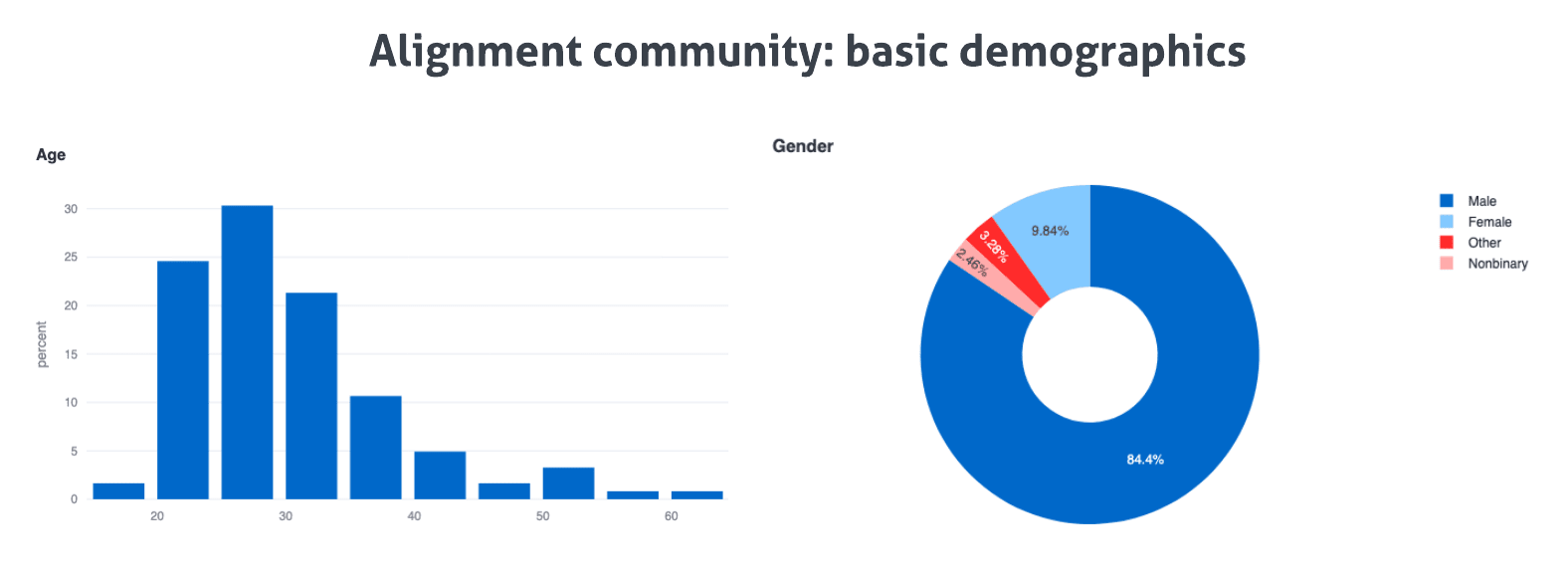 We set out to better explore and compare various population-level dynamics within and across both groups. We examined everything from demographics and personality traits to community views on specific EA/alignment-related topics. We took on this project because it seemed to be largely unexplored and rife with potentially-very-high-value insights. In this post, we’ll present what we think are the most important findings from this project.