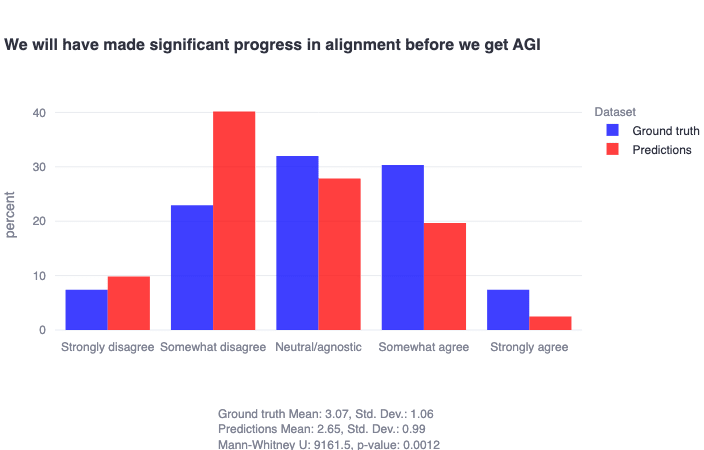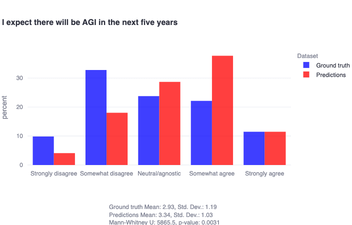 - Result: Alignment researchers generally do not expect there to be AGI within the next five years—but erroneously predict that the alignment research community does generally expect this.