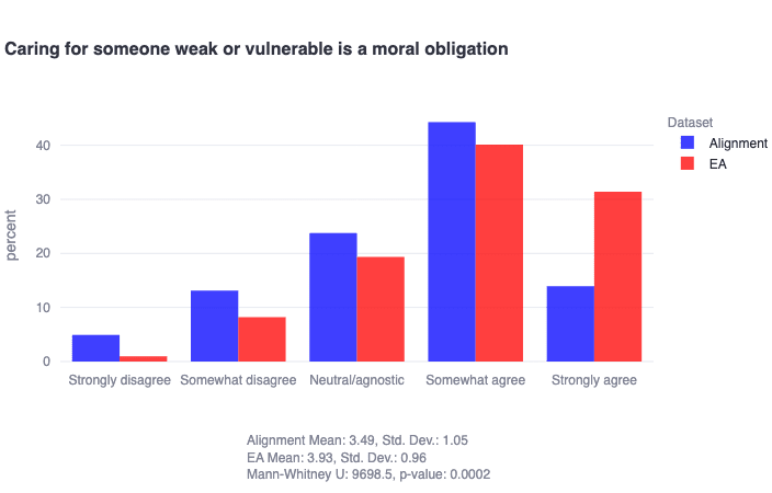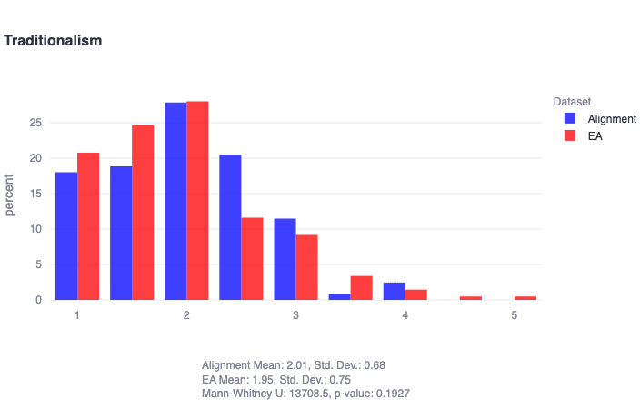 - Result: EAs and alignment researchers have reasonably distinct moral foundations. We tested a model of moral foundations that uses three factors: traditionalism, compassion, and liberty. While both communities place low value in traditionalism, EAs seem to value compassion significantly more than alignment researchers. By contrast, both communities are fairly normally distributed in valuing liberty, but alignment researchers tend to skew towards liberty and EAs tend to skew away from it.
