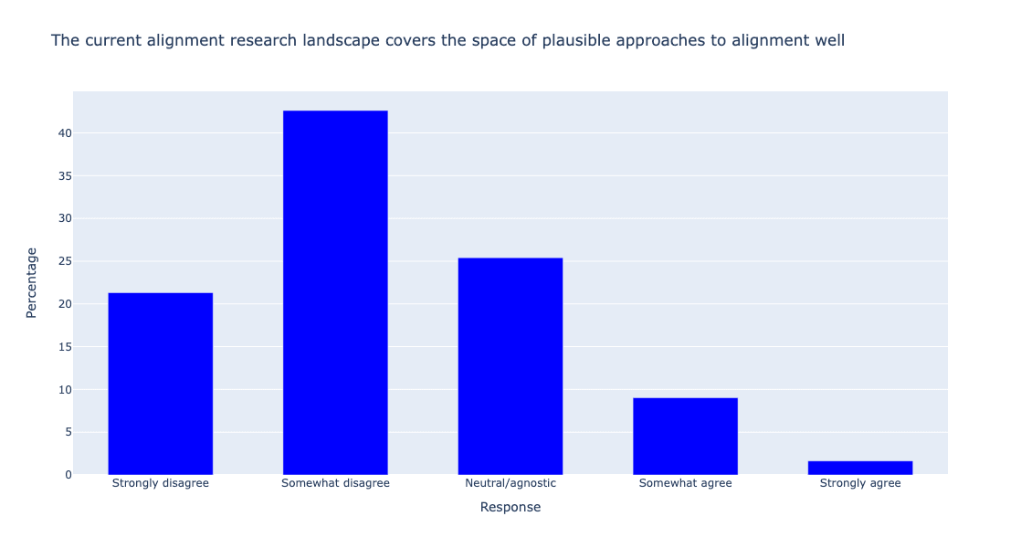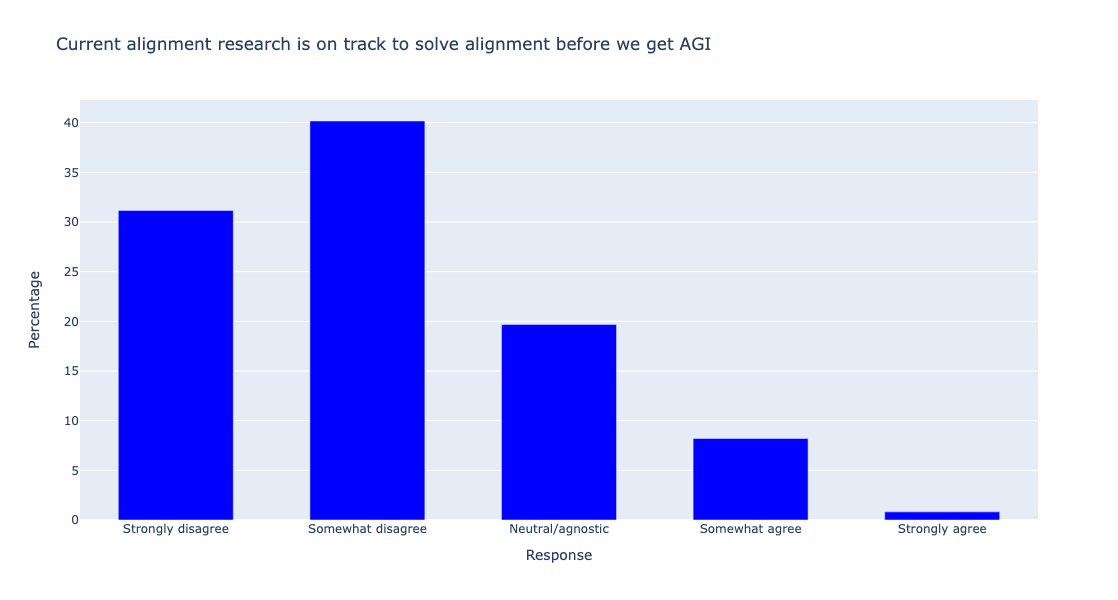 - Result: Alignment researchers generally do not believe that current alignment research is on track to solve alignment and do not think that current research agendas exhibit strong coverage of the full space of plausible alignment approaches. However, alignment researchers did prove impressively accurate at predicting the research community’s overall views on the relative promise of various technical alignment research directions (as systematized by Shallow review of live agendas in alignment & safety).