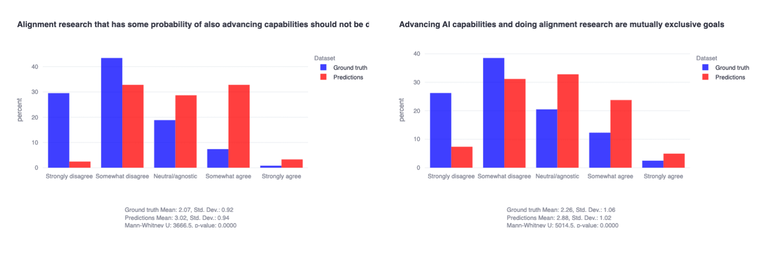 - Result: Alignment researchers generally disagree with statements like ‘alignment research that has some probability of advancing capabilities should not be done’ and ‘advancing AI capabilities and doing alignment research are mutually exclusive goals.’ Interestingly, researchers also erroneously predicted that the community would generally view safety and capabilities work as incompatible.
