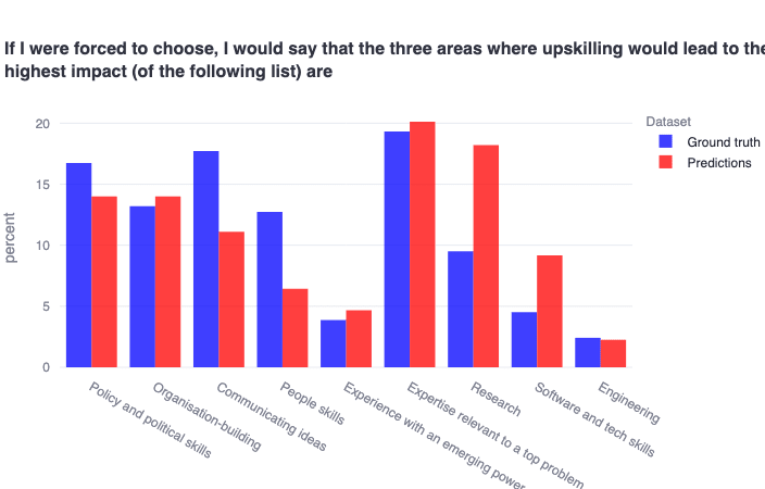 Finally—and not entirely unrelatedly—we highlight the finding that EAs have diverse views on the most important areas for upskilling (options pulled directly from 80000 Hours’ skills list). While generally well-calibrated, the community appears to overestimate the predicted value of upskilling in ‘harder’ skills like research and coding, while underestimating the predicted value of ‘softer’ skills like communicating ideas and being good with people. Overall, EAs think (and predict correctly) that gaining expertise relevant to a top problem is the most valuable area to upskill.