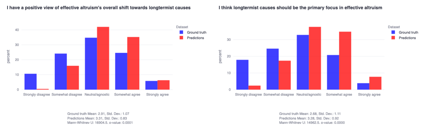These results straightforwardly demonstrate that the EAs we sampled clearly predict that the community would have positive views of 'longtermism x EA' (what we also would have expected), but the group is actually far more evenly distributed with a slight negative skew on these questions (note the highly statistically significant differences between each prediction vs. ground truth distribution; p≈0 for both).