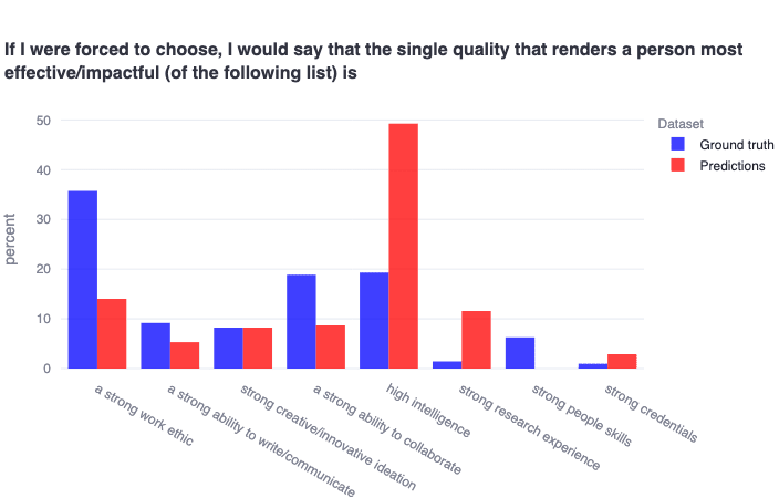 We also find in both datasets—but most dramatically in the EA community sample, plotted below—that respondents vastly overestimate (≈2.5x) how much high intelligence is actually valued, and underestimate other cognitive features like having strong work ethics, abilities to collaborate, and people skills. One potentially clear interpretation of this finding is that EAs/alignment researchers actually believe that high intelligence is necessary but not sufficient for being impactful—but perceive other EAs/alignment researchers as thinking high intelligence is basically sufficient. The community aligning on these questions seems of very high practical importance for hiring/grantmaking criteria and decision-making.