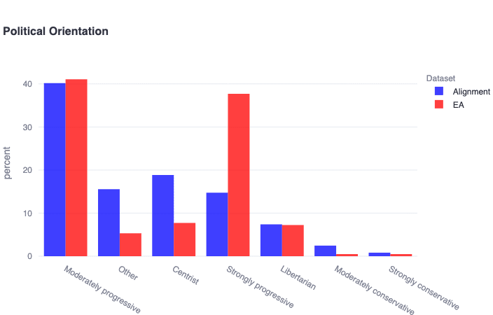 Overall, we find that approximately 55% of alignment researchers identify as politically progressive to some extent, while approximately 80% of EAs identify in the same way. While there appear to be a negligible number of self-identified conservatives in either community (n=4 in alignment, n=2 in EA), there do appear to be a diversity of other political views at play in both samples (including a significant number of highly unique written-in affiliations/leanings across both samples that we somewhat crudely lumped under ‘Other’). It is worth noting that the lack of self-identified conservatives could fuel similar problems as has been well-documented in academia, especially to the degree that policy advocacy is becoming an increasingly prominent cause area of both communities.