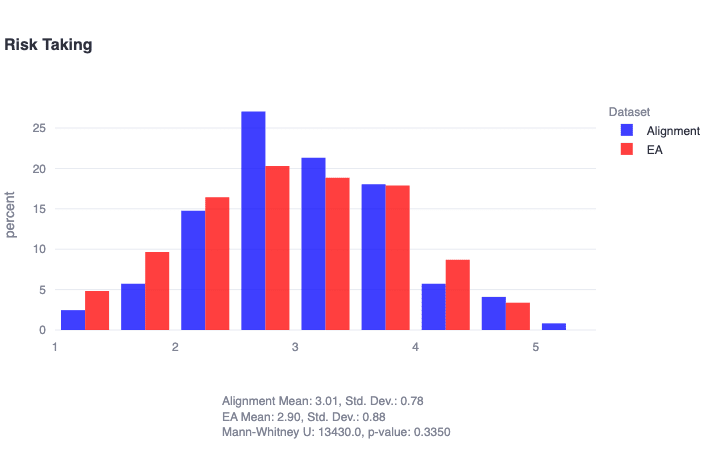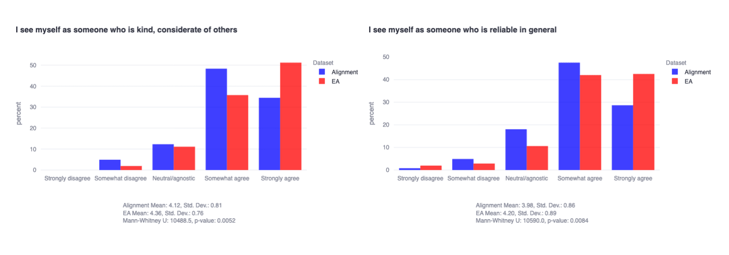 In spite of significant trait similarities across the two communities, we also find that EA respondents on average are more conscientious (t=2.7768, p=0.0058) and more agreeable (t=3.0674, p=0.0023) than the alignment community respondents, while alignment researchers tend to be slightly (though not statistically significantly) higher in openness. It is possible that EAs are more broadly people-oriented (or otherwise select for this) given their prioritization of explicitly-people-(or-animal)-related causes. It is also possible that the relative concreteness of EA cause areas, as compared to the often-theoretical world of technical AI safety research, may lend itself to slightly more day-to-day, industrious types.