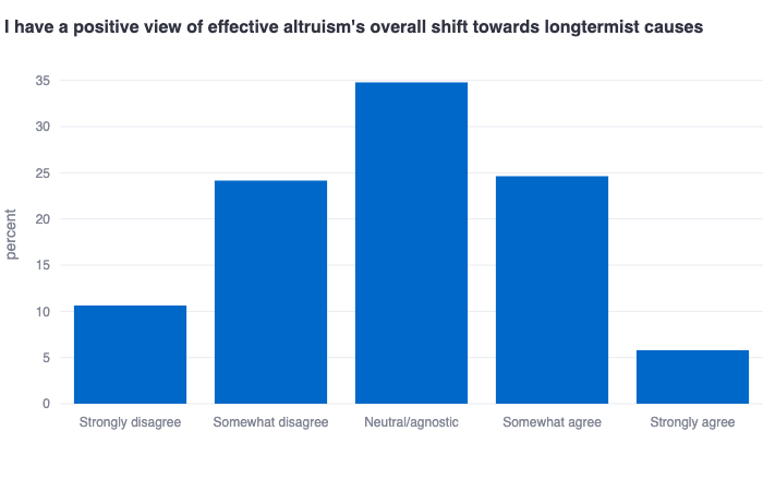 Regarding the question of EA's attitudes towards the "overall shift towards longtermist causes", I would also say that, taken in isolation, it's reasonable to interpret your result as showing that actively involved EAs are lean slightly negative towards EA's shift towards longtermism. Again, our cause prioritisation results suggesting strong and increasing prioritisation of longtermist causes by more engaged EAs across multiple surveys gives me pause. But the main point I'll make (which suggests a potential conciliatory way to reconcile these results) is to observe that attitudes towards the "overall shift towards longtermist causes" may not reflect attitudes towards longtermism per se. Perhaps people are Neutral/Agnostic regarding the "overall shift", despite personally prioritising longtermist causes, because they are Agnostic about what people in the rest of the community should do. Or perhaps people think that the shift overall has been mishandled (whatever their cause prioritisation). If so the results may be interesting, regarding EAs' attitudes towards this "shift" but not regarding their overall attitudes towards longtermism and longtermist causes.