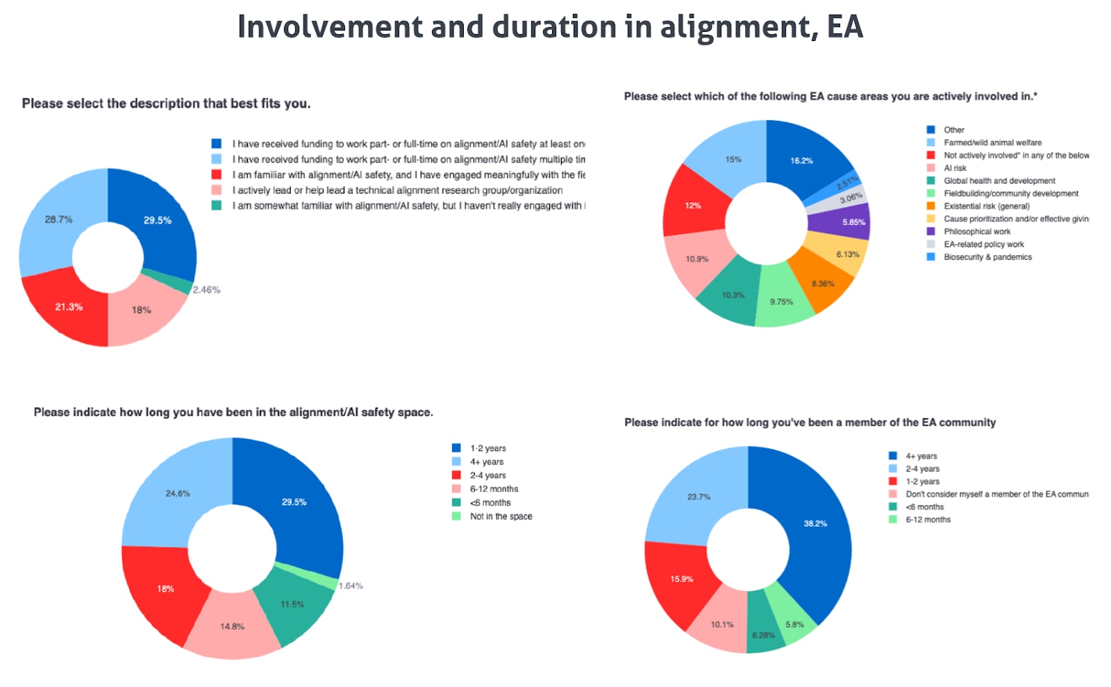 Roughly 65% of EA respondents and 40% of alignment researchers have been involved in the space for 2 or more years. EA respondents demonstrate significant diversity in the cause area in which they are actively involved, and the alignment dataset is shown to include researchers at various stages of their careers, including a significant sample of researchers who are actively leading alignment organizations.