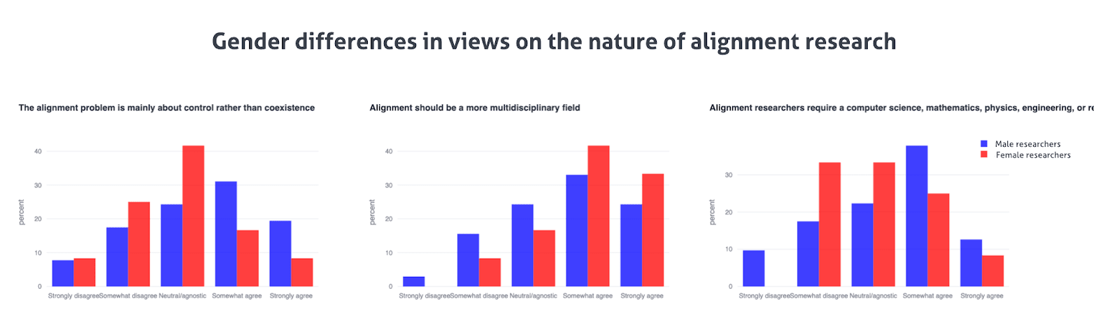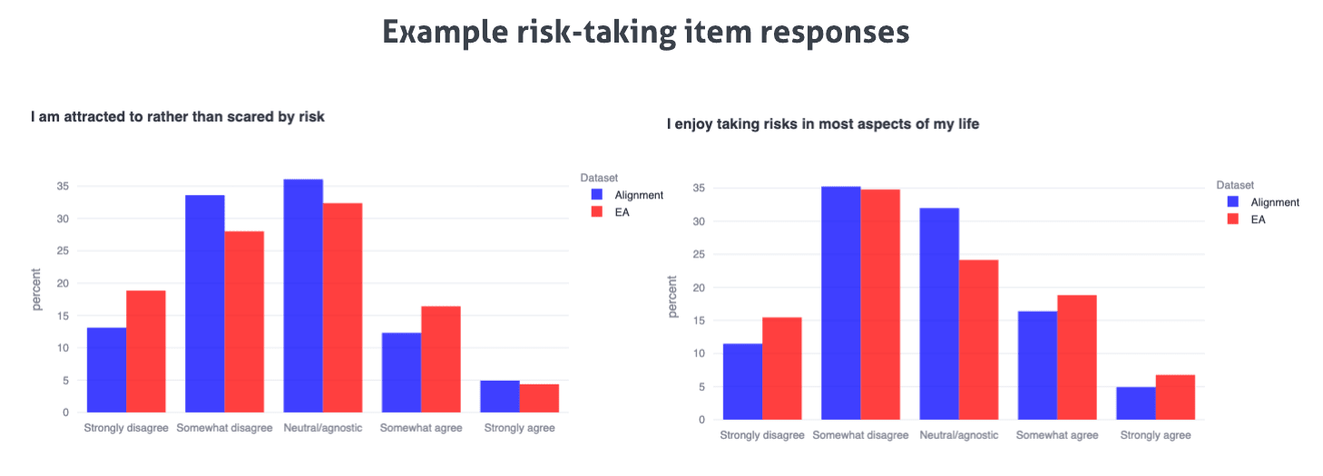 - Implications: Both communities’ heightened sensitivity to negative emotion and risk aversion may be part of what motivates interest in the causes associated with EA/alignment—but these traits may also prevent bold and potentially risky work from being pursued where it might be necessary to do so. Alignment researchers should also probably put explicit effort into recruiting highly qualified female researchers, especially given that current female alignment researchers generally do seem to have meaningfully different views on foundational questions about alignment.