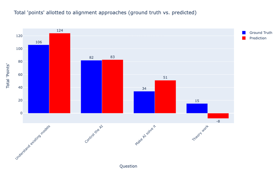 This result indicates that alignment researchers are most excited about evals and interpretability work, followed by various prosaic alignment approaches (eliminating deception, finetuning/model edits, goal robustness, etc.), are relatively less excited about ‘make the AI solve it’ approaches (the most prominent example being superalignment), and are even less excited about more theoretical approaches, including provably safe architectures, corrigibility, and the like. This result also clearly demonstrates that alignment researchers are well-calibrated in understanding that the community has this general prioritization.