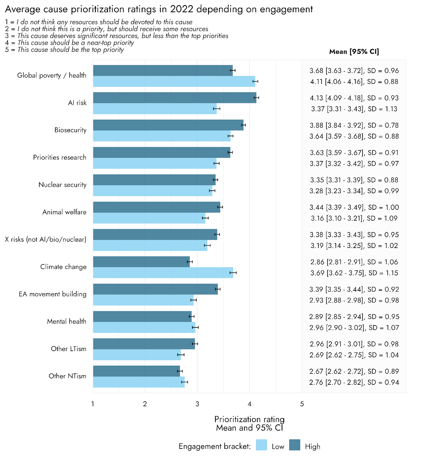 Moreover, as noted, the claim that it is "the most important consideration" is quite strong. People may be clearly longtermist despite not endorsing this statement. Looking at people's concrete cause prioritization, as I do above, we see that two longtermist causes (AI Risk and Biosecurity) are among the most highly prioritized causes across the community as a whole and they are even more strongly prioritised when examining more highly engaged EAs. I think this clearly conflicts with a view that "EAs have lukewarm views about longtermism... EAs (actively involved across 10+ cause areas) generally seem to think that AI risk and x-risk are less promising cause areas than ones like global health and development and animal welfare" and rules out an explanation based on your sample being more highly engaged.