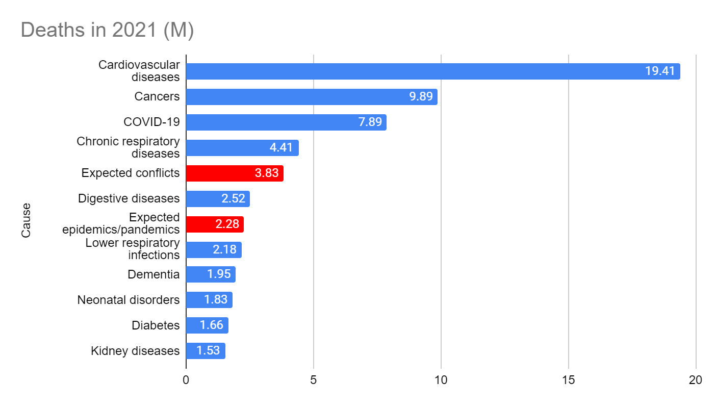 Here is a graph with the top 10 actual causes of death and expected conflict and epidemic/pandemic deaths: