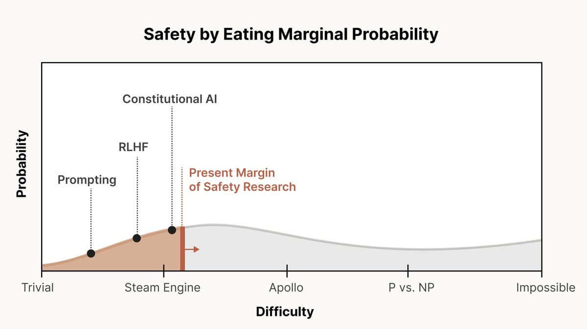 I like Chris Ola’s (Anthropic co-founder) take on this question. He frames the difficulty of alignment as a distribution over possible ‘scales of difficulty’ from ‘trivial’ to ‘impossible’. His view (and Anthropic’s view in extension) is that of a large probability spread between options, with a bump between ‘steam engine’ and ‘the Apollo mission’ levels of difficulty (See Figure 1 for reference). Note that he says currently we have enough safety work to reach the ‘steam engine’ level of difficulty (Figure 2). Lots more work ahead.