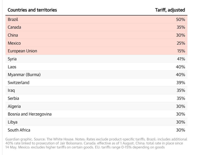 Aside from shredding immigration, the main thing Trump has done to harm the economy is impose sweeping tariffs. The chart below illustrates the countries hit hardest by tariffs: