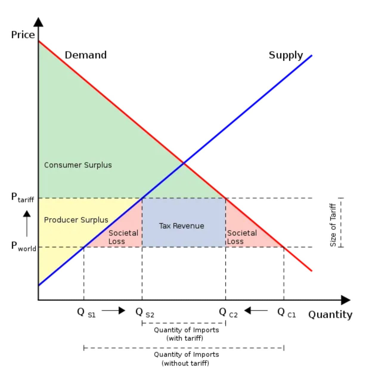 Suppose you have a product that you can produce for a dollar. I value it at two dollars. So you sell it to me at a price of $1.50. That’s win-win. But if there’s a tariff, then even though the exchange would have been worth it and benefitted us both, it can’t go through because we’re not willing to do it with the tax. Maybe I’ll buy the product from Americans, and you’ll sell it to someone in your home country, but that means Americans will be doing things they’re worse at, and you’ll be selling to people who want a product less. If one country is better at producing goods than another, then both benefit if they both do what they’re best at—tariffs, unfortunately, prevent comparative advantage from working.