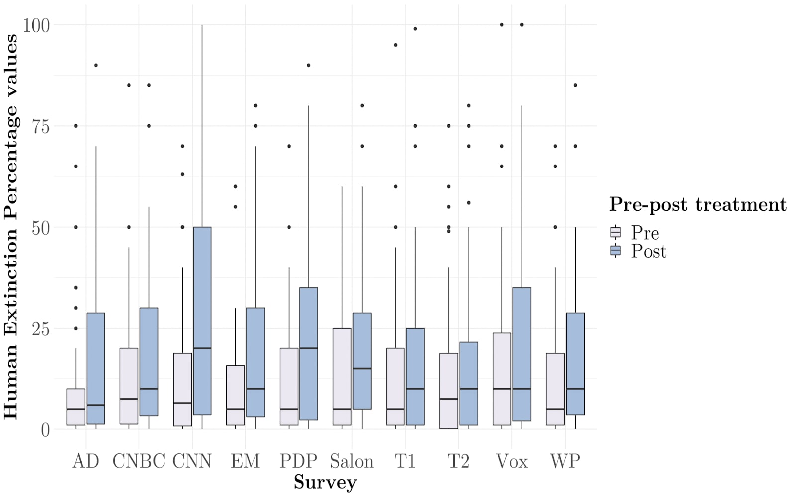 Figure 2: Pre-post summary of the distribution of percentage values for the Human Extinction Percentage indicator across surveys