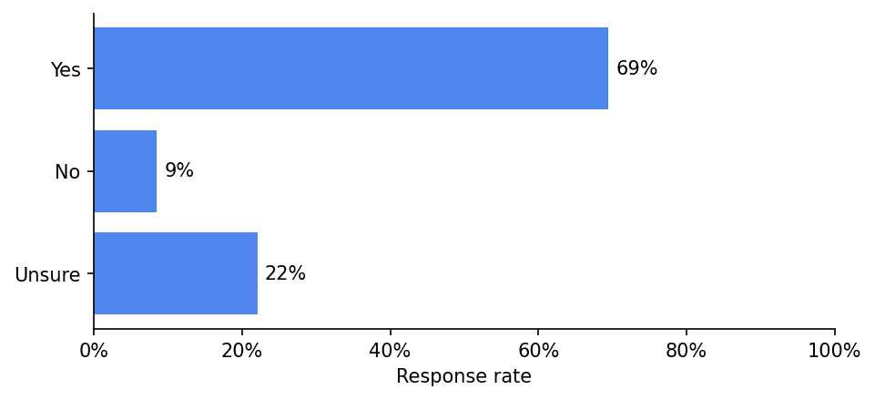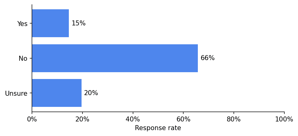 Above I aggregated the 'agrees' and 'disagrees' into two larger groups, but even broken down into the four smaller groups I struggle to find an interpretation which doesn't leave some significant fraction of respondents committed to what seems like a very problematic position. And this is hardly a niche gotcha; this seems like a very basic question that should occur almost immediately to someone thinking professionally about it.