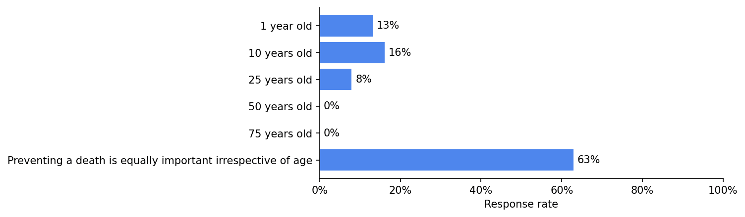 "Preventing a death is equally important irrespective of age" strikes me as a genuinely insane position, although I guess maybe the 63% agreeing with it have something saner in mind that is closer to it than giving an exact age.