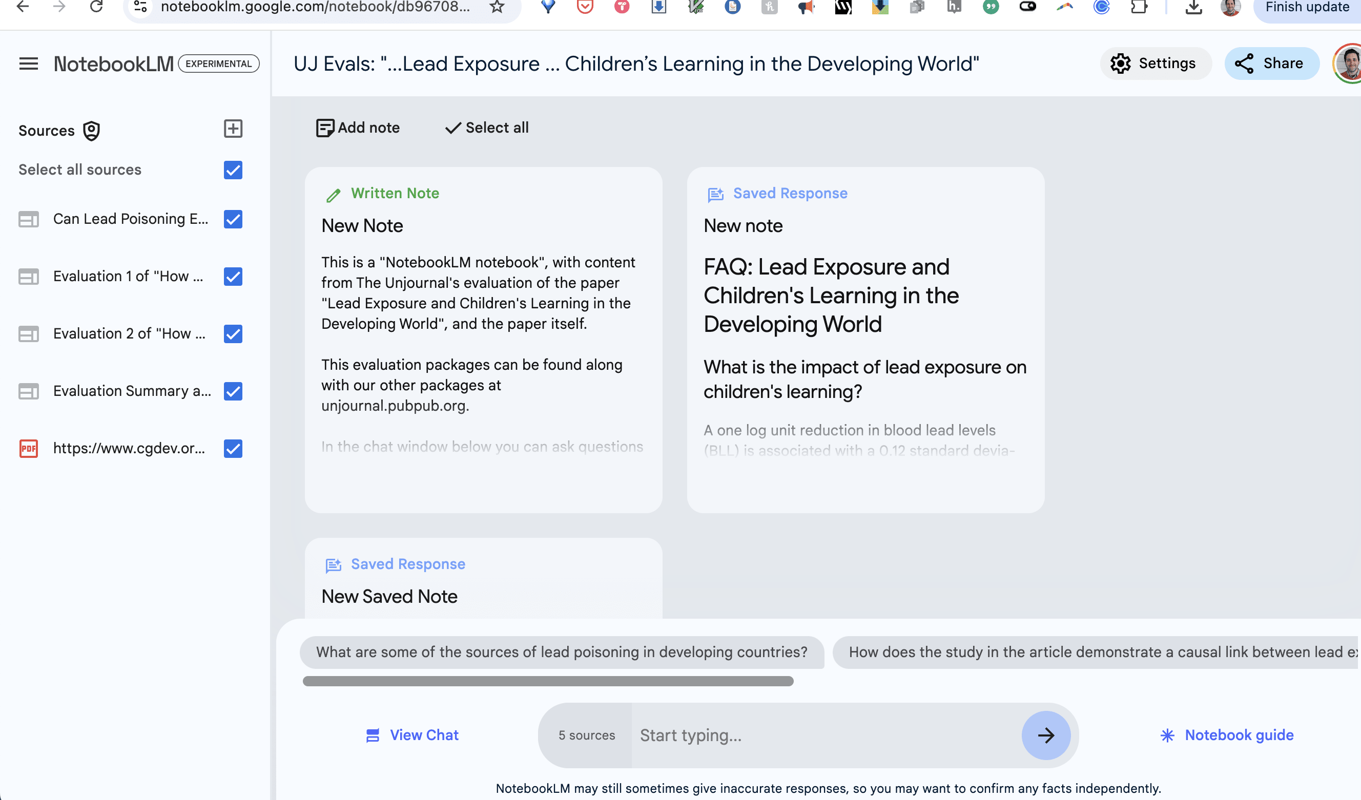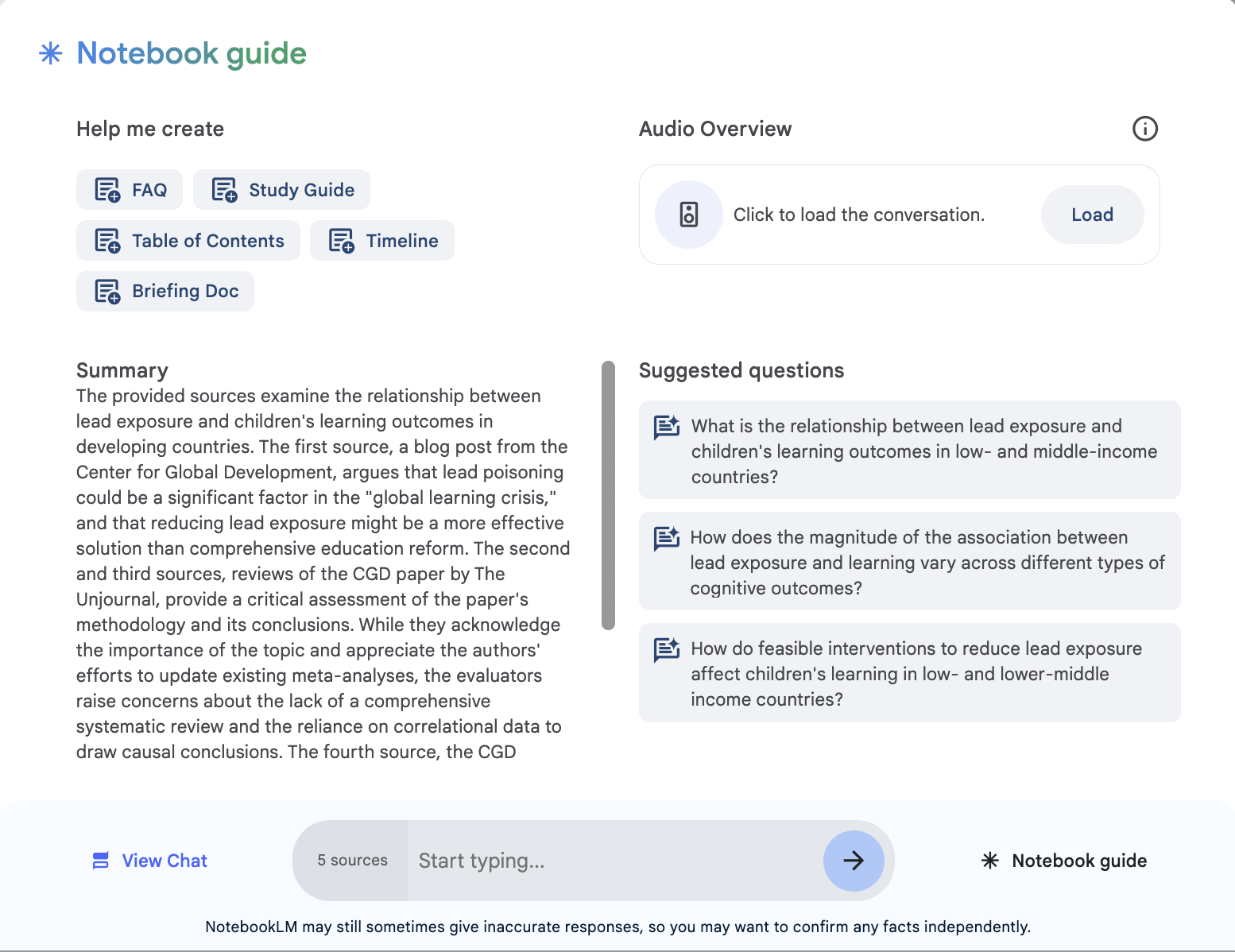 NotebookLM seems particularly easy to set up, and seems to be yielding some positive results. This tool got some eyeballs in academic social media for its AI-generated podcasts of research (aimed at a lay audience, cheerleading, some inaccuracies; e.g., see here and here, with caution), but its notebook chat feature seems more useful for us.