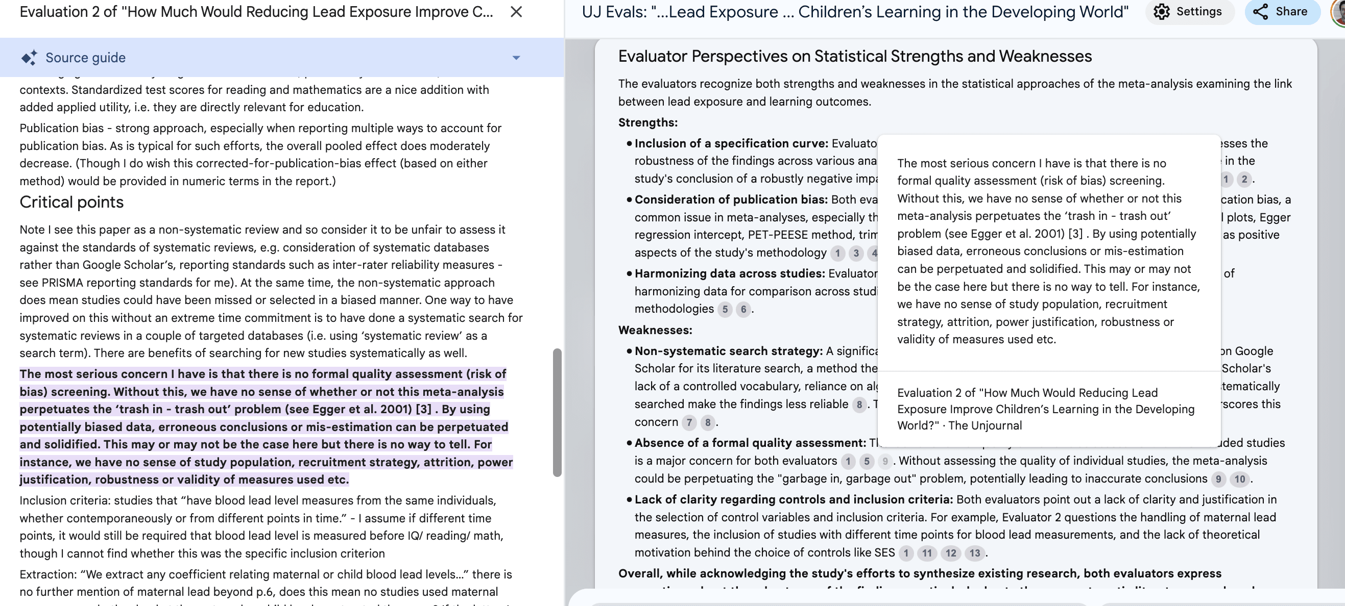 It seems to give fairly useful and accurate answers. It sometimes mixes up things like ‘what we suggest for future evaluators to do’ and ‘what the evaluators actually wrote’. But it tracks and links the sources for each answer, so you can double-check it pretty easily.