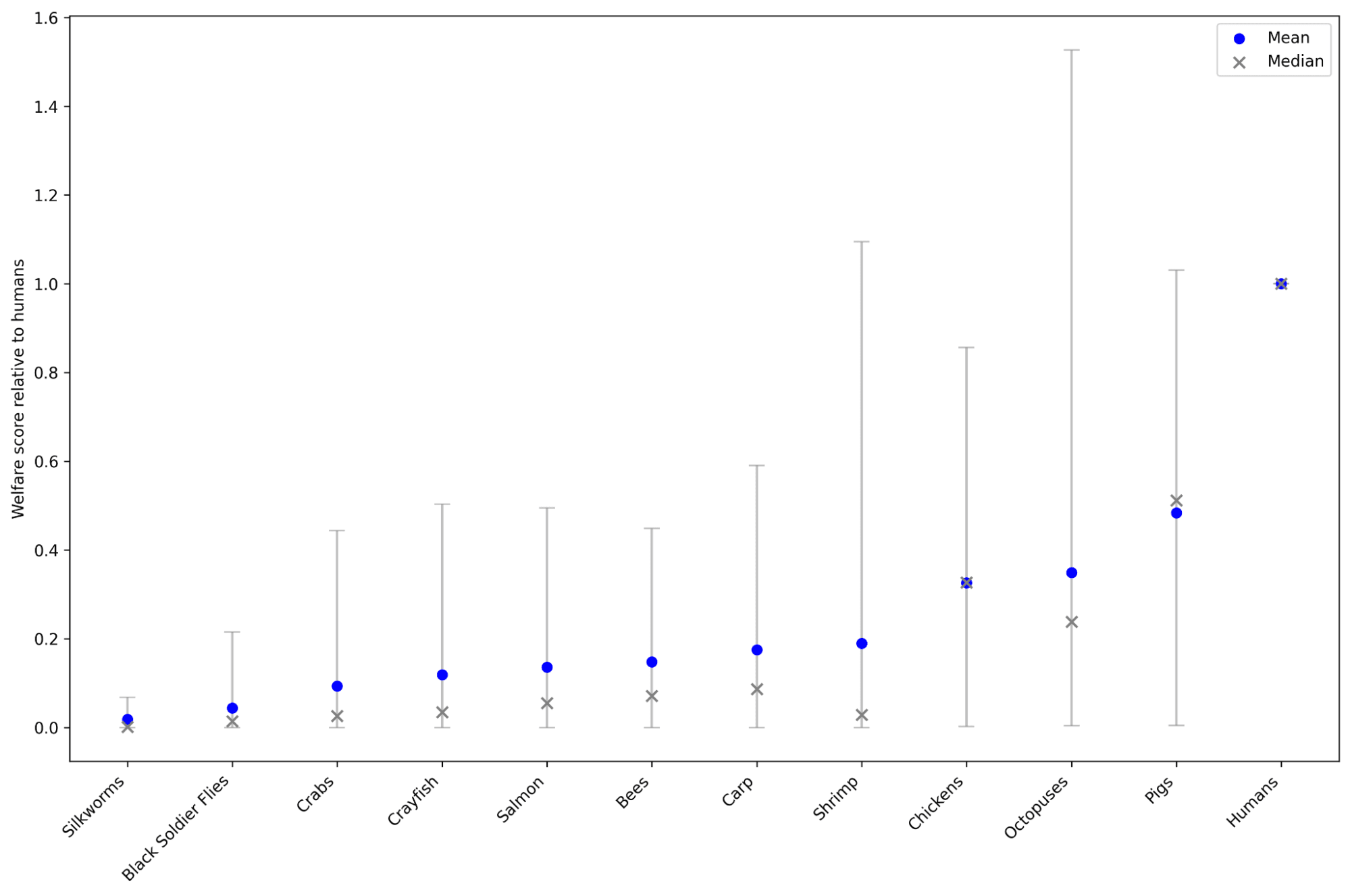 In some cases (shrimp and octopuses), the upper errors go higher than for humans — we’d guess this mainly represents how little we know about these species (and is an artefact of the way uncertainty was simulated). When we spoke to one of the researchers, they suggested this is likely because of the ‘subjective experience of time’ adjustment. In the case of shrimp, it’s worth noting how low the median value is: a full 50% of the probability is that the value for shrimp is smaller than that cross.