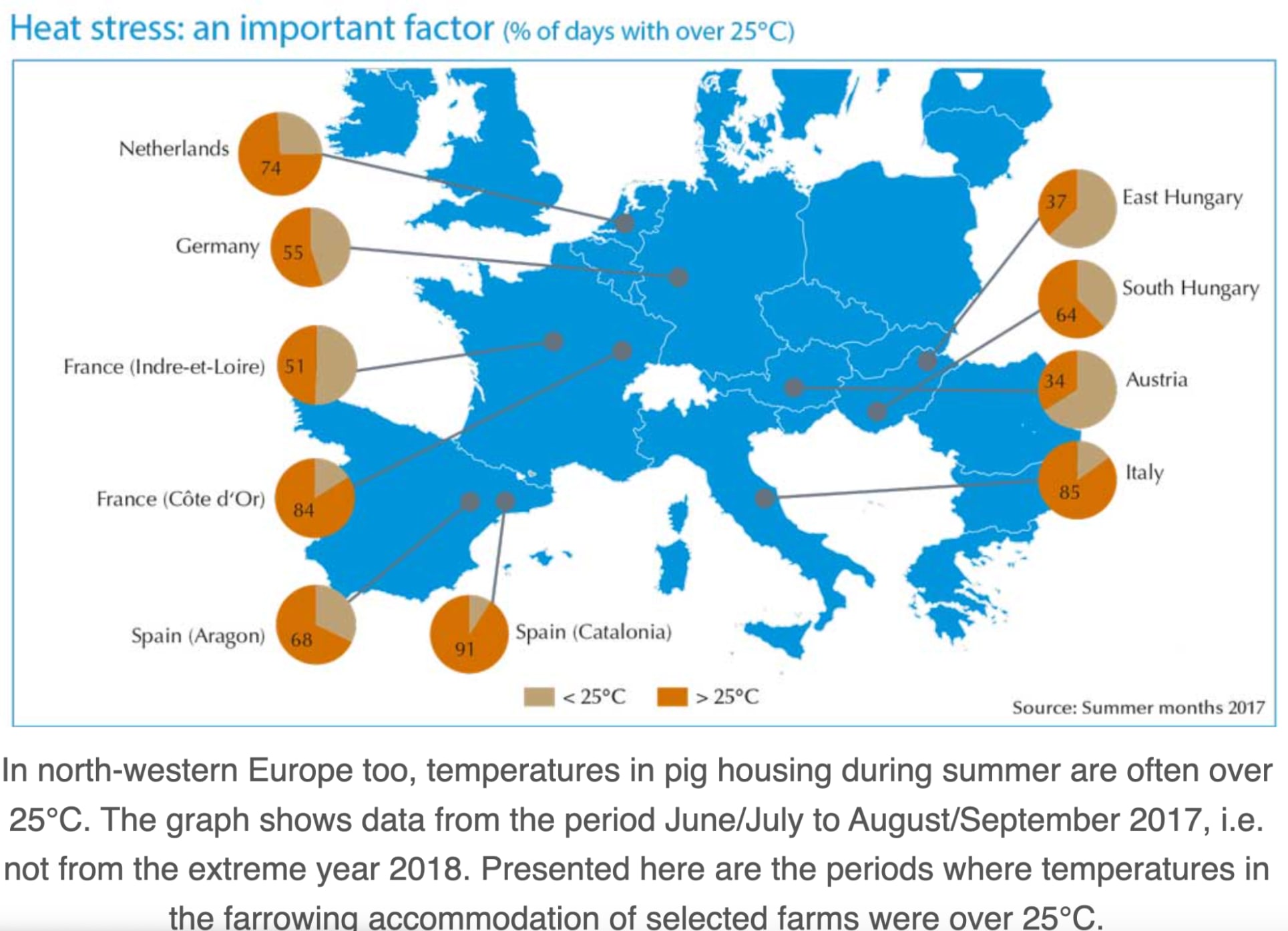Most farmed pigs are kept indoors on high-density farms.[30] Heat stress is common, reaching temperatures of 30 to 40°C — which is particularly bad as pigs do not sweat; instead they keep cool in the wild through wallowing and rooting.[31]