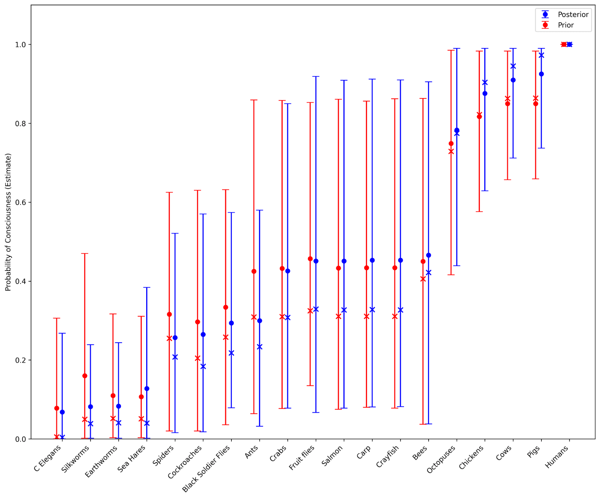 The ordering of animals in these results fit with my intuitions better; fruit flies are less likely to be conscious, while octopuses are more likely to be conscious.