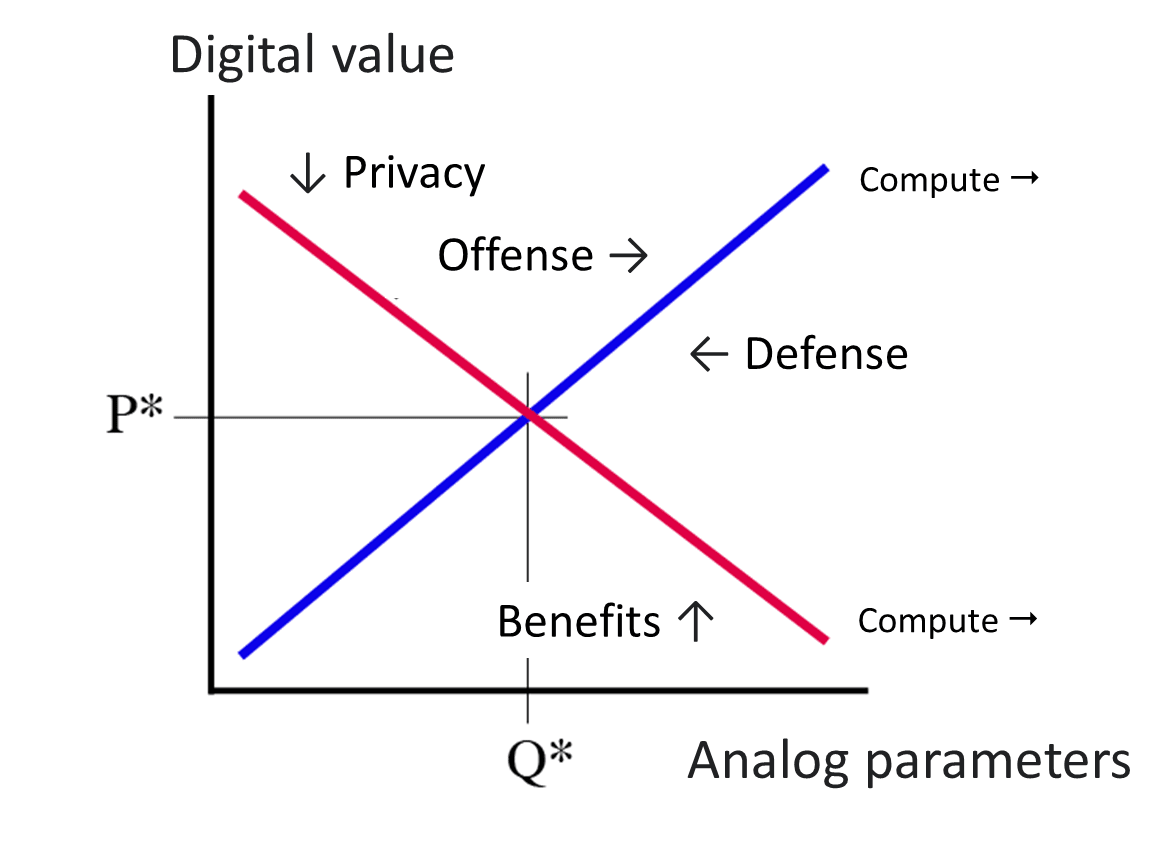 The O-D balance entirely neglects the role of privacy, which is shown in the demand curve. If the technological security situation deteriorates, we might become less willing to put their personal information on the internet to get stolen (and governments and corporations might likewise have less leverage to nudge people to do so), nudging demand down and thereby restoring equilibrium. Absent such a threat, however, these stakeholders obtain benefits from the uses of data, and therefore will tend to ignore privacy concerns. These benefits could even include important factors for development like financial inclusion; "privacy" in this context could also include money laundering restrictions which would make it more difficult to send money around the world at the touch of a button.