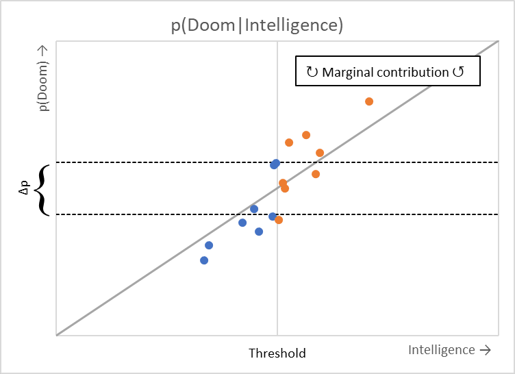 Without a threshold, your estimation of p(Doom) in a net sense may be close to zero: the risk of "doom" is about the same after crossing the threshold of "superintelligence" as before (whatever the hypothesized definitions of those terms.) Or maybe not: it would depend on how much variation in the X axis - the independent variable - is preserved after splitting the world into those two cases. Maybe most scenarios within those two cases will reside far from the cutoff point, but p(Doom) is supposed to measure the variation between cases, not within them. Moreover, even in that case, it would not be fair to characterize this view as "AI risk skepticism," because a significant risk of doom exists in most scenarios, regardless of precisely on which side of the threshold they reside - which is caused specifically by computational intelligence, and proportional to its growth. In some sense, then, you may be even more concerned about risks from AI, including existential ones, than someone concerned only about risks which arise above the threshold.