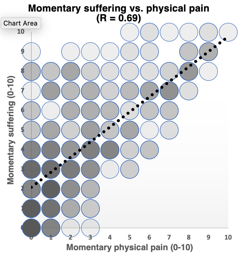 As we would expect, physical pain is closely tied to suffering (see graph below), yet it is distinct: some people who aren’t in any significant physical pain may report high levels of suffering due to other physical symptoms and/or psychological causes, and some who report experiencing serious physical pain report a lower numerical value for suffering intensity. However, everyone with 10/10 suffering (8 respondents in total) had at least 5/10 physical pain, and from 4/10 physical pain and up, suffering was never more than 2 intensity points lower. There are meditative approaches that some practitioners can use successfully to reduce the suffering caused by physical pain, but any such effect wasn't strongly apparent among the respondents in moderate (4-6/10) or severe (7-10/10) physical pain.