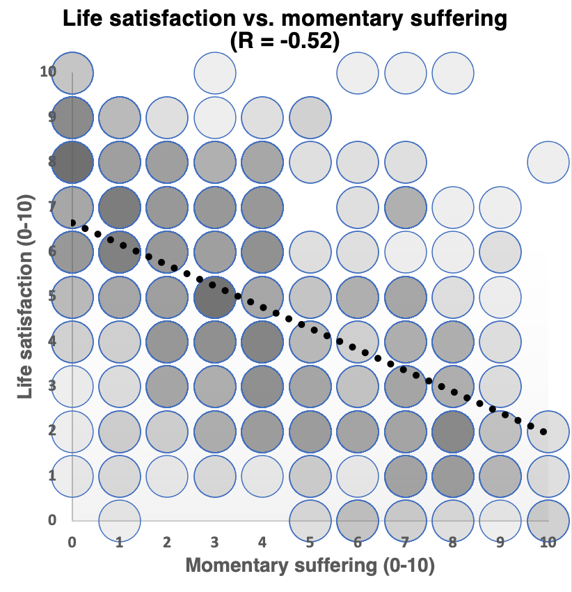 Life satisfaction and suffering were only moderately negatively correlated (see graph below), as expected from past studies on subjective wellbeing. Suffering is more of a direct experience, whereas life satisfaction is more of a cognitive evaluation and subject to a range of biases. To the extent that suffering matters for its own sake, life satisfaction doesn’t fully capture this dimension of negative wellbeing or disvalue.