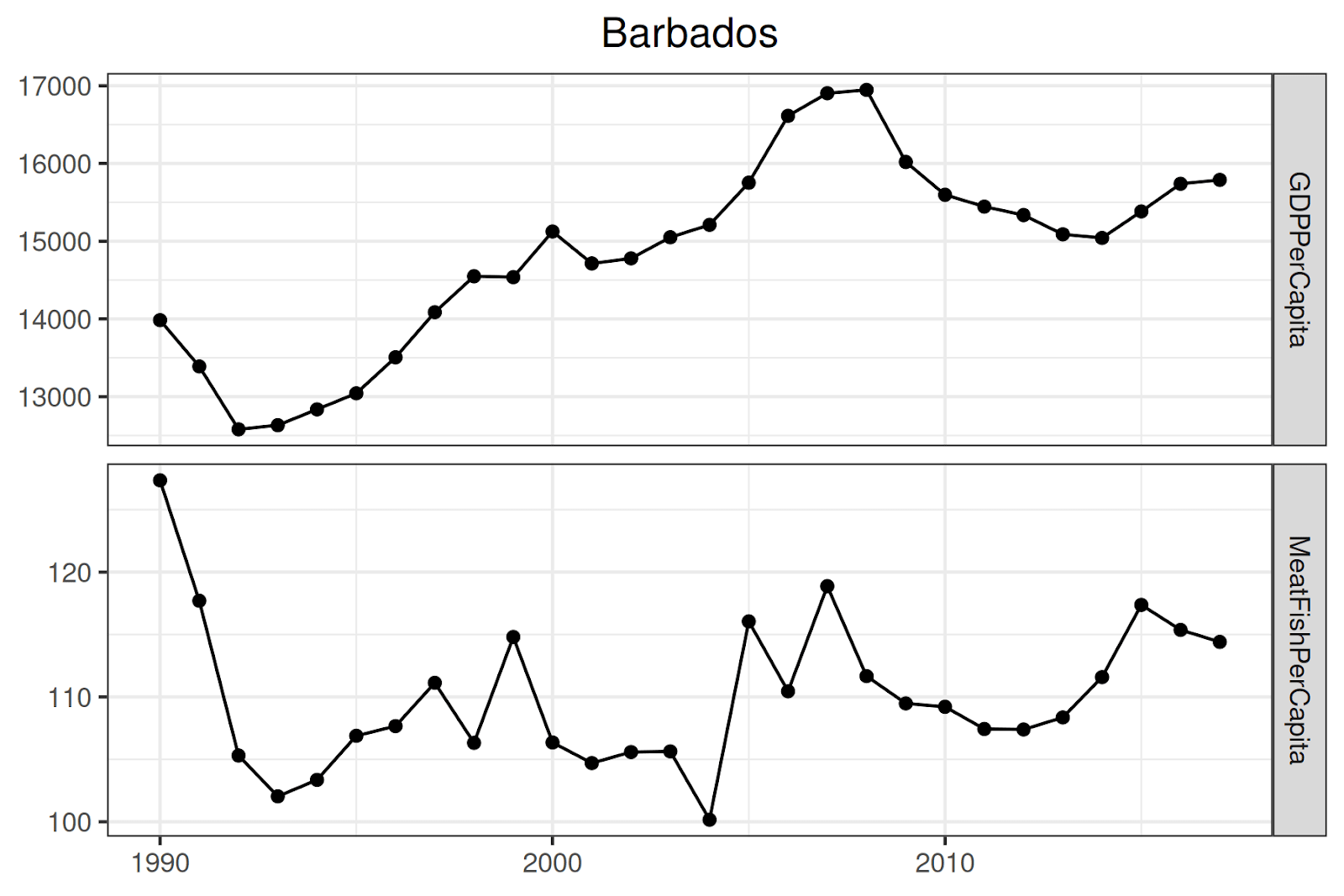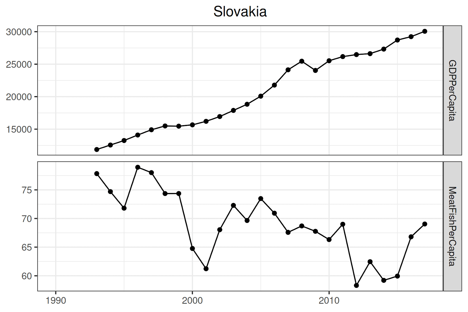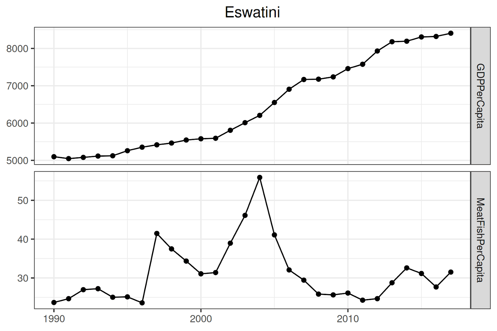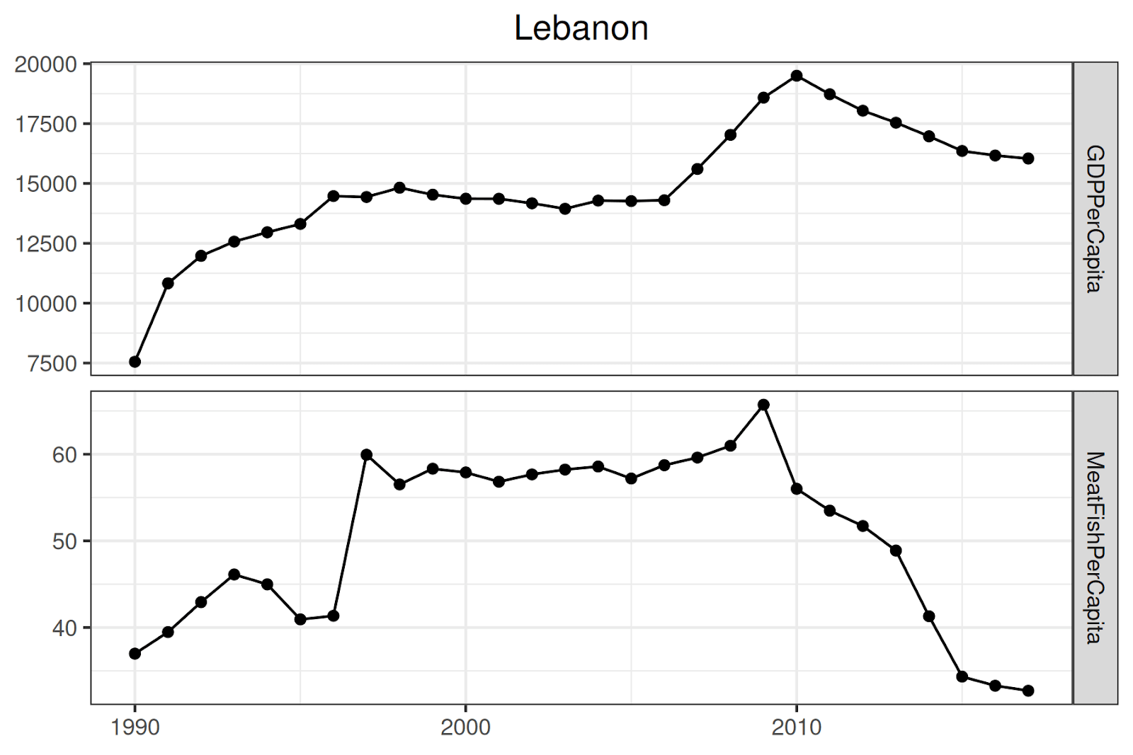 - We removed data points that did not have data for all three of meat consumption per capita, fish consumption per capita, and GDP per capita. This allows us to compare, for each country, the trend in meat + fish consumption and GDP per capita across a single, consistent time period.