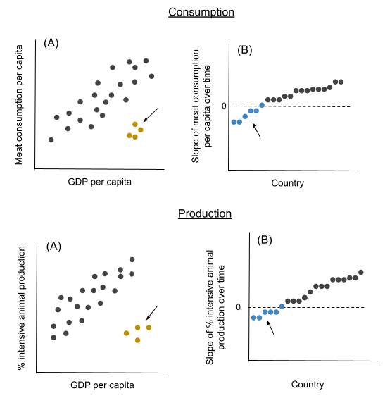- The second type of outliers we will call 'slope outliers'. Imagine we produce a graph showing a number of countries for a particular year. The horizontal axis simply lists all of the countries. The vertical axis shows the slope of meat consumption per capita over time. A positive value means that the country's meat consumption per capita has increased over the years. A zero or negative value means that the country's metric has not increased over the years. This means that the country's value for a given metric has remained steady, or has decreased, even as the country develops (assuming the country's GDP per capita has indeed increased over time). These countries are indicated in Figure 2B using an arrow and blue data points.